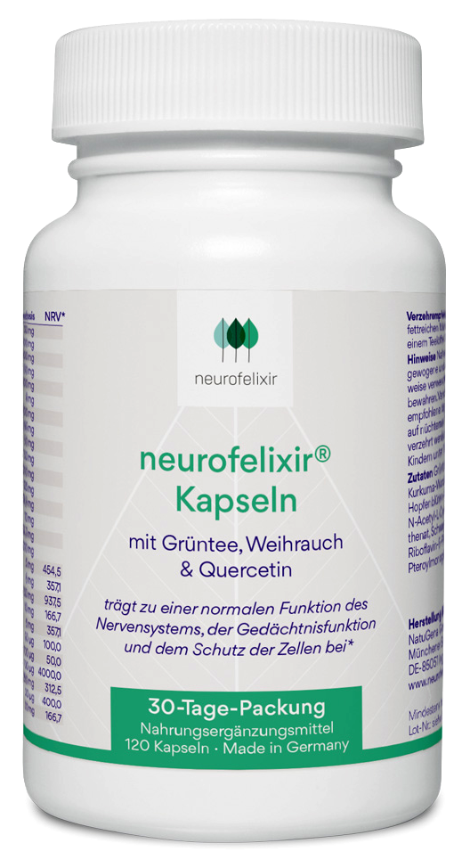 neurofelixir® ist ein Nahrungsergänzungsmittel mit wichtigen Mikronährstoffen zum Schutz der Zellen, für die Gedächtnisfunktion und den Energiestoffwechsel. Forschern der Stammzellbiologie und führenden Experten der Neurologie ist es mit neurofelixir® gelungen, über 20 sekundäre Pflanzenstoffe, Aminosäuren und Vitamine in einem Präparat zu vereinen.
