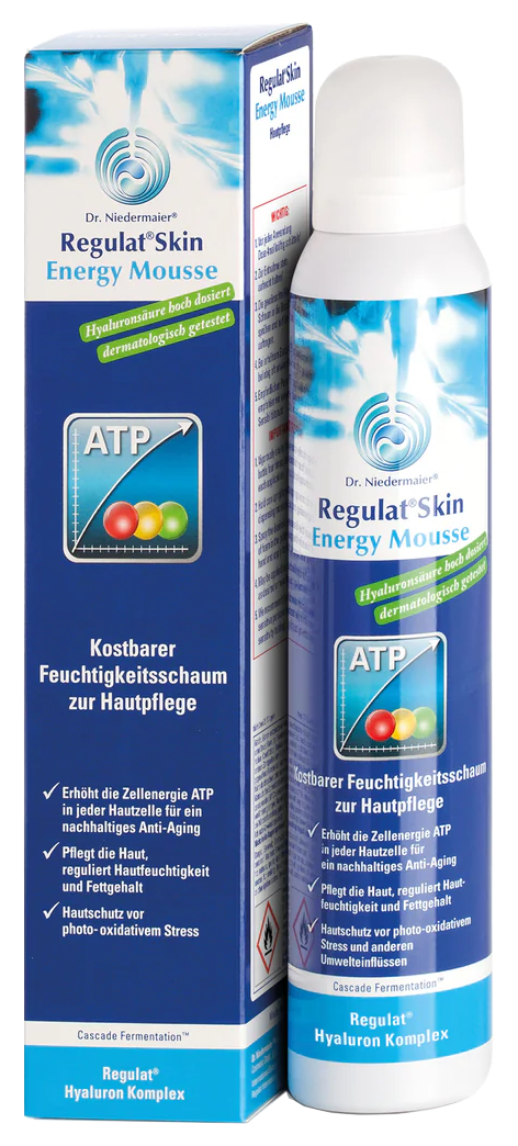 Regulat® Skin Energy Mousse enthält die einzigartige Kombination aus Regulatessenz® und hoch- und niedermolekularer Hyaluronsäure, die Alterungserscheinungen der Haut entgegenwirkt und sie vor äußeren Einflüssen schützt.